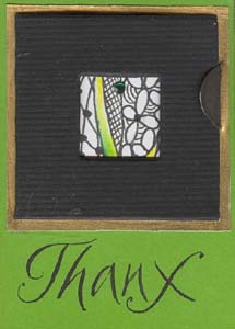 I decided to make Thank you ATC's for each player. I recently came across Zentangles and am having fun with them and went off on a tangent doing a calligraphic letter and using a bit of colored pencil detail work. |