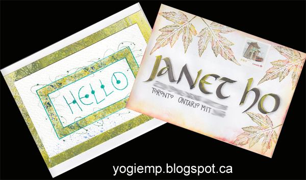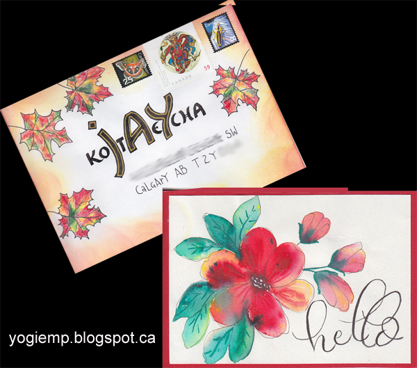 ID: Jay Kotecha (Nov 2021) Watercolor flower card and I love the way I wrote out the word "Hello". Envelope in Funky Neuland using a 6.0 and 2.4 Parallel pen and Sumi ink, accented the letters with a gold gel pen. Drew the maple leaf and repeatedly transfered it to the envelope coloring with Prisma colored pencils. Sponged Distress pads around the edge. |