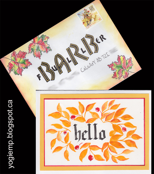 ID: Barb Fuller (Nov 2021) Envelope in Funky Neuland using a 6.0 and 2.4 Parallel pen and Sumi ink, accented the letters with a gold gel pen. Drew the maple leaf and repeatedly transfered it to the envelope coloring with Prisma colored pencils. Sponged Distress pads around the edge. Card is watercolor as seen by TwitcherWrites on Instagram. |