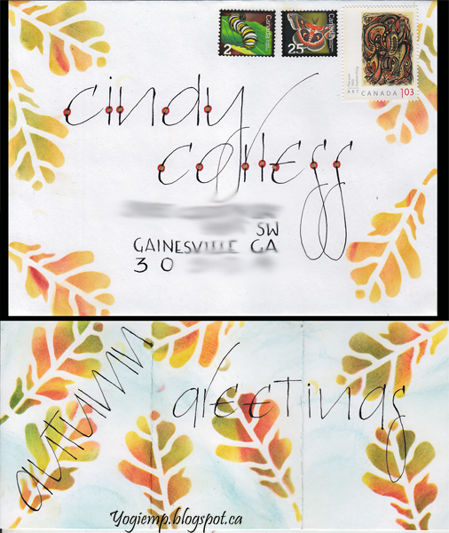 ID: Cindy Corless (Oct 2021) On Staples white 110# cardstock, created the triptych ATC. Stenciled the oak leaves using Distress ink pads and wrote in the words "Autumn Greetings" using a pointed pen and Sumi ink in Weaver style lettering. Repeated the technique on the envelope adding Zig red bullet tip dots and then a gold gel pen dot. |