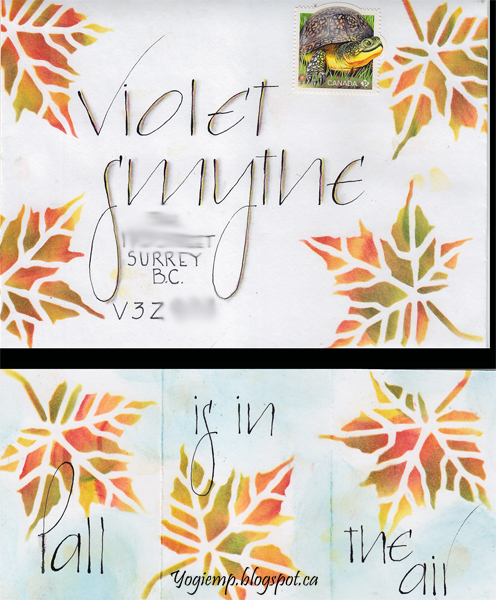ID: Violet Smythe (Oct 2021) On Staples white 110# cardstock, created the triptych ATC. Stenciled the maple leaves using Distress ink pads and wrote in the words "Fall is in the air" using a pointed pen and Sumi ink in Weaver style lettering. Repeated the technique on the envelope. Shadowed with graphite pencil and paper stump then added a thin line with a yellow and a pink Prisma colored pencil. |