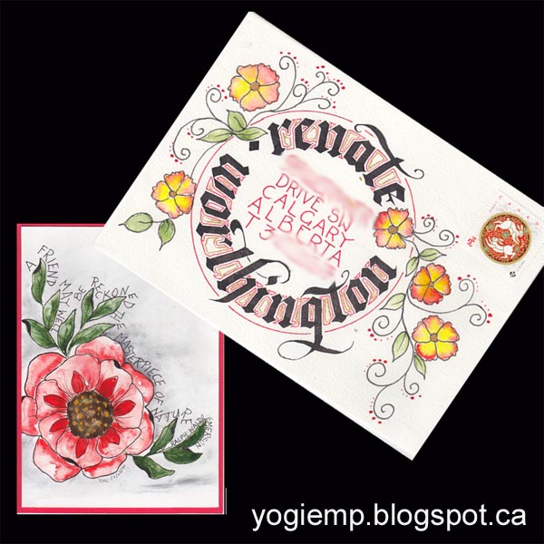 ID: Renate Worthington (Aug 2021) I've been really playing with calligraphy within circles and thought I'd try it on an envelope. Love the way it turned out. I used a Parallel pen and Sumi ink and then detailed with a red Zig Writer. Painted the flowers with Kuretake Clean Color watercolor brush pens. The card is a watercolor I did recently and add a quote Words: A friend may well be reckoned the masterpiece of nature. Ralph Waldo Emmerson