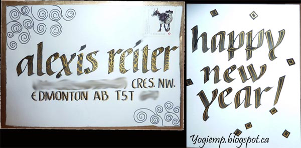 ID: Alexis Reiter (Jan 2021) I used a 6.0 parallel pen filled with Sumi ink for the Italic style letters for the name, then doodled them using a pointed pen nib and Kuretake "Gold Mica" ink (my new favorite gold ink)... it comes in silver too.