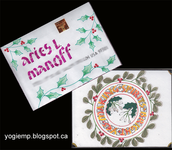ID: Aries L Manoff (Dec 2021) Name done in Carrioka style lettering with a Zig-Zag pattern using deAtramentis ink "Magenta-Red/Gold and a 4.5 Parallel pen. Decorations with Zig Writers. Card is a print of one of my Xmas cards |