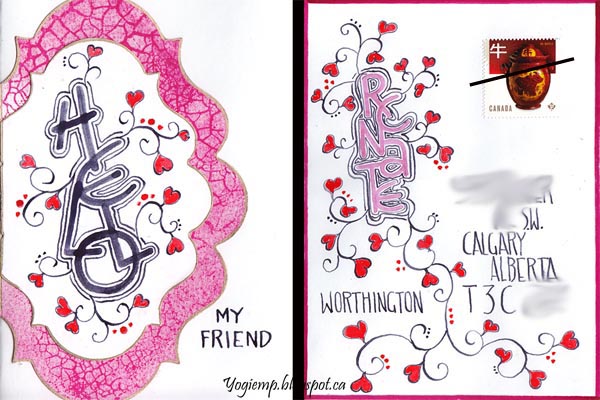 ID: Cathy Anne Bauer (Feb 2021) I used to love doing my Kersal letters, but seemed to stop for a while, so thought I'd start doing them again BIG GRIN. Black Zig Writer and colored pencils with a touch of glitter. The heart envelope card is a structure I learned in Julie Wildman's Valentine Card class this month. Geli print paper. |
