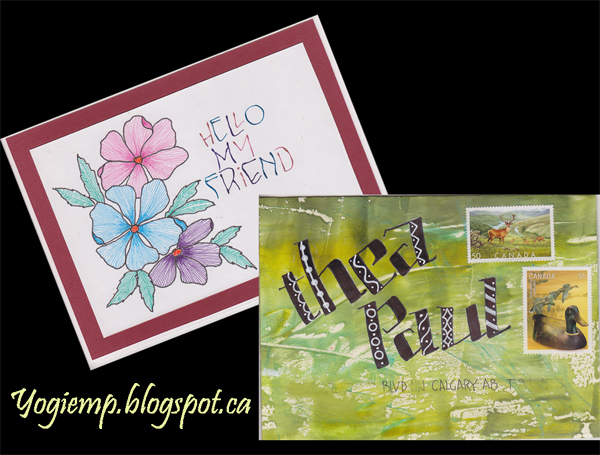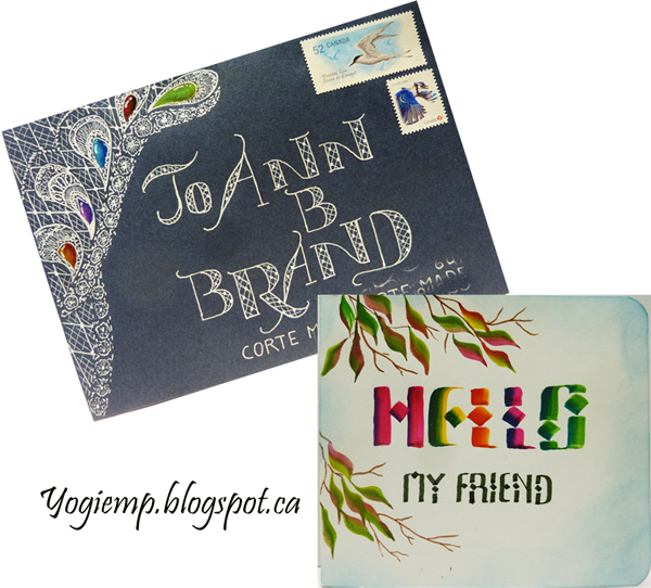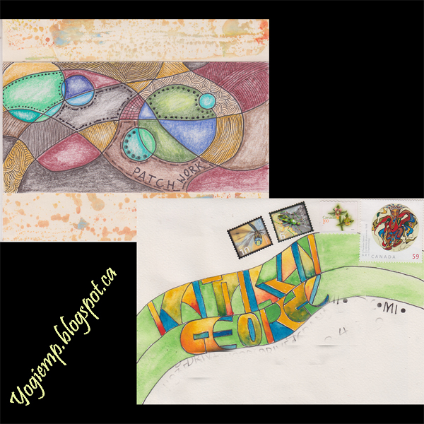 Env created on Arches Text Wove paper in lettering style taught by Lorraine Douglas in Letters As Art class in March. Drew out the letters with a Zig Writer and painted with various w/c colors. The card was created from a doodled piece I had done and mounted onto one of my geli prints.