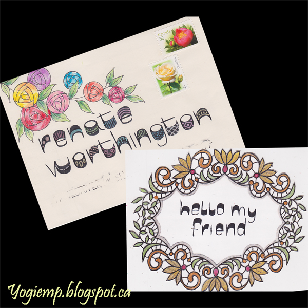 ID: Renate Worthington (Aug 2025) Env created on Genoa Bond paper, Funky letters with a Marvy 5.0 Calligraphy marker and doodled with various colored metallic gel pens. Deco roses with Prisma colored pencils. The insert (not a card) was something I created a long time ago and colored with FineTech metallic paints |
