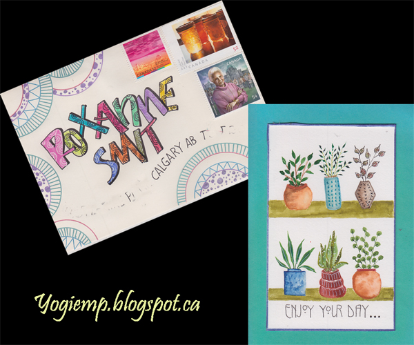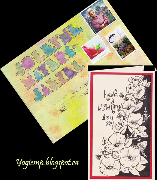 ID: Roxanne Smit (May 2025) Env created on Columbia Mills LBS End Paper, Funky/doodled letters with a Zig Writer, Prisma colored pencils, white gel pen, and various colors of Juice Up pens. The card was created during one of the online classes I took. |