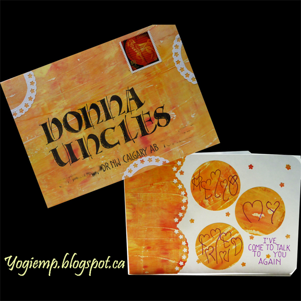 ID: Donna Uncles (Sept 2025) Env created on Columbia Mills LBS End paper Gelli print. Funky lettering with a broad edge marker and touch ups... Die cut bits of scalloped circles. The card was created with leftovers of the Gelli print paper. |