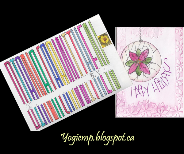 ID: Diana Carwithen (Dec 2025) Env created on Canson Mixed Media paper (I think). Drew out the elongated letters of her name and colored with every color of my ZIG Calligraphy marker set... The card was from my stash... I'm trying to use them up.