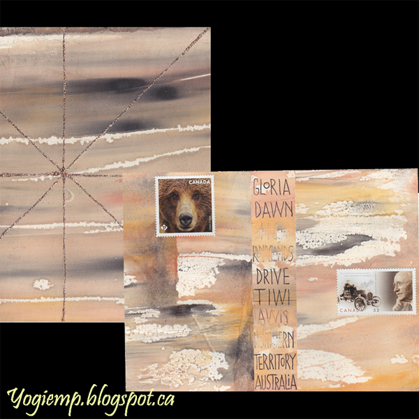 ID: Gloria Dawn (Feb 2026) Env created from a geli print on Genoa Bond paper. I decided to write the name and address in a vertical orientation... not sure if that's allowed with our mail system... I love the look of it though. The card was also from that same piece of geli print and adhered to a white card base. It had some fold creases on it so camouflaged with the copper glitter lines. I decided to leave it without text. Rare for me...