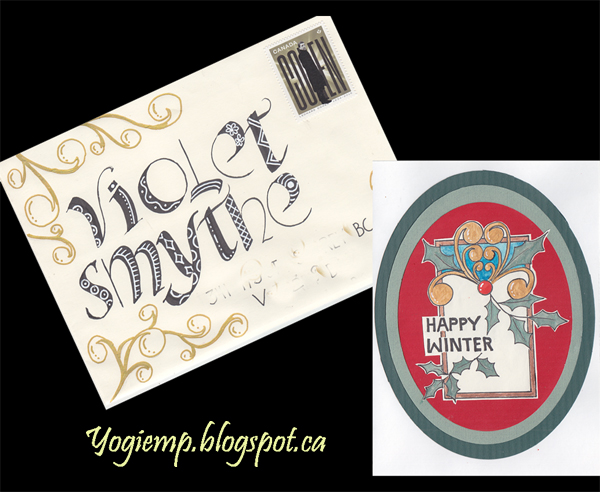 Env created on Canson Ingres paper in a funky lettering style. Drew out the letters and lace work with a Gelly Roll and Juice Up white gel pens adding gems using Prisma colored pencils. The card was created a while back...