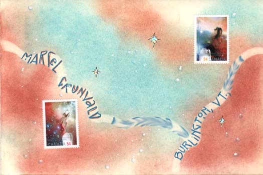 Size: 5.25" h x 7.5" w I used Columbia Mills, Cream Toned Folio end sheets for this envelope. These two postage stamps are another set of beauties that I really like. Love the colors in them. I used Pan pstels to color the background, then erased my lines for writing. Used Prisma colored pencils for the lettering. Then speckled the envelope using white gouache and shadowing the spots with a blue colored pencil. I sprayed this envelope with Krylon workable fixative. I then added some holographic Peel Off stars. |