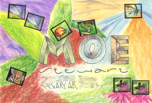 Size: 5.25" h x 7.5" w I recently introduced a friend of mine to using nice postage stamps rather than just buying the generic stamps. So I thought I'd create an envelope with the endangered insects series including the one that just came out, the caterpillar - which she's not too fond of, Big Grin. I used Columbia Mills, Cream Toned Folio end sheets for this envelope. Another friend showed me a letter exercise sample sheet done by Annie Cicale that were very graphic and the type of lettering I like doing. I've finally had a chance to use them. I used the flat edge of my HB pencil to do my graduated shading, then went over it with a colored pencil. I then placed the stamps in a pleasing configuration and started extending the leaf images in them or other images in them and coloring them in with my Prisma colored pencils. I also dry embossed the veins in the leaves, usually before coloring but a few were done after some coloring. The rest of the address was done with a black Zig Writer. |