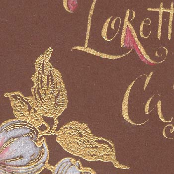 Dogwoods with a white Prisma colored pencil and added some peachy detail. The Lettering was done with Ecoline Gold and a Hunt 56 nib in a funky style. When dry went in with my colored pencils (same as for the flowers) and accented some of the letters or shade areas. |