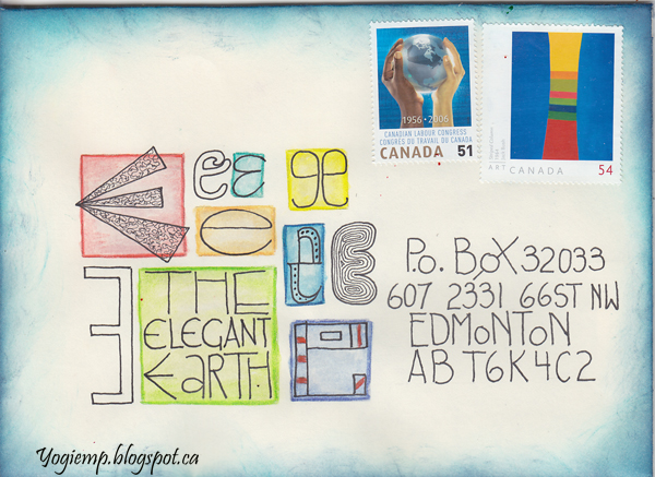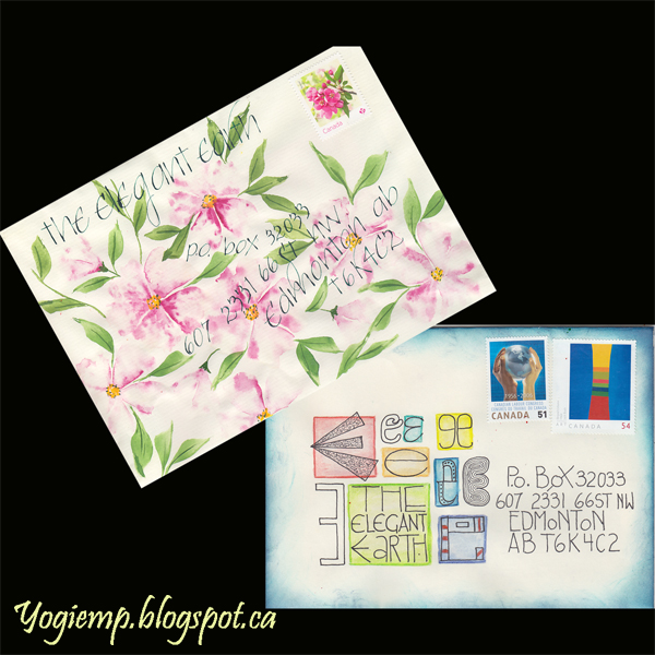 The Edmonton Calligraphy Society extended the deadline for a postmarked envelope... so decided to make a couple more envies. BIG GRIN Since I just took a class with Mike Gold "Variations on "A"" I decided to use that techniques for one of my envies replacing the "A" with "E" Outlined the boxes with Derwent Inktense watercolor pencils and then blended with a wet brush. Wrote the various letters with Micron pens. Sponged the envelope edges with Distress pads. Since I wanted to kind of match the flowers with my stamp I used my triangle brushes and Winsor & Newton watercolors. Used a pointed pen and green gouache for the Weaver style lettering.