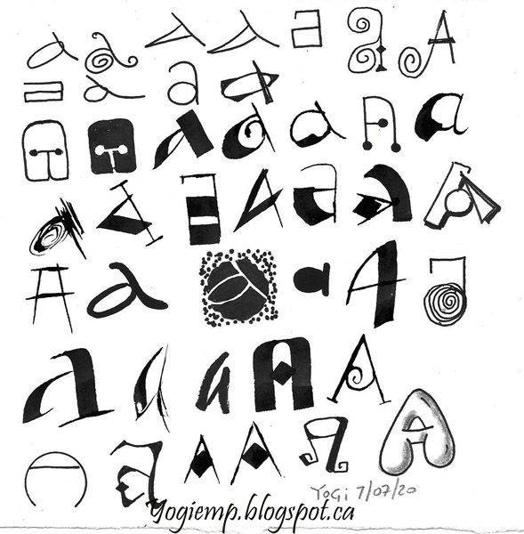 "A" exemplar. On white 110# cardstock using various tools (Zig Writer - fine tip and bullet tip, 6.0 Parallel pen and Sumi ink, Pentel Pocket Brush, Graphite pencil) |