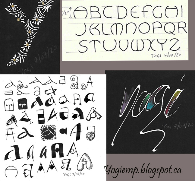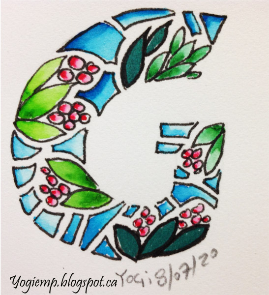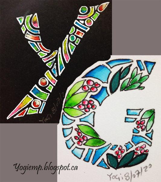 More of these fun letters. Did another "Y" and a "G". They're both approx 1.5"w x 2"h The "Y" is Bleed Proof white with a pointed nib and colored with Prisma colored pencils on black Recollections c/s. The "G" is a Zig Writer and Peerless watercolors on Arches 0# HP w/c paper