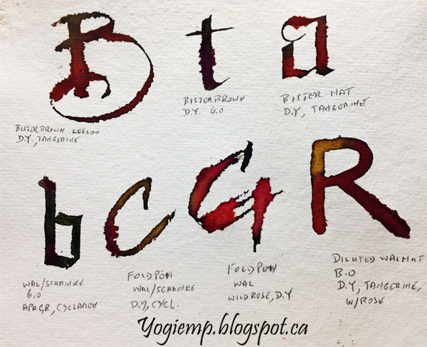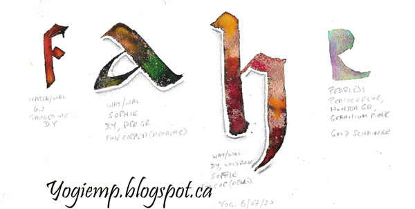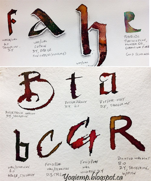On Indigo 140# CP hand made watercolor paper (very rough) and using Dr Martin's Radiant w/c B: Bister Brown ink, Dreamig Dogs "Leeloo" ruling pen, dropped in Tangerine and Daffodil Yellow. t: Bister Brown ink, 6.0 parallel pen, Daffodil Yellow. a: Bister Natural, 6.0 parallel pen, Daffodil Yellow and Tangerine. b: Regular strength walnut ink with Schminke gold powder, 6.0 parallel pen, April Green and Cyclamen c: Regular strength walnut ink with Schminke gold powder, Folded pen Daffodil Yellow and Cyclamen G: Regular strength walnut ink, folded pen, Wild Rose and Daffodil Yellow R: Diluted walnut ink, B-0 nib, Daffodil Yellow, Tangerine and Wild Rose On Arches Text Wove and watered down Walnut ink. f: Diluted walnut ink, 6.0 parallel pen, "Tangerine" and "Daffodil Yellow". a: Diluted walnut ink, Dreaming Dogs "Sofie" ruling pen, "Daffodil Yellow" and April Green, Neuberg Ebel Fine Copper powder. h: Diluted walnut ink, Dreaming Dogs "Sofie" ruling pen, "Daffodil Yellow" and Wild Rose, Neuberg Ebel Fine Copper powder. R: This was something extra that Julie was showing us. Loaded letter with water and dropped in Peerless w/c- Peacock Blue, Hunter Green & Geranium ink. Sprinkled with Schminke gold powder. |