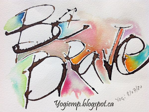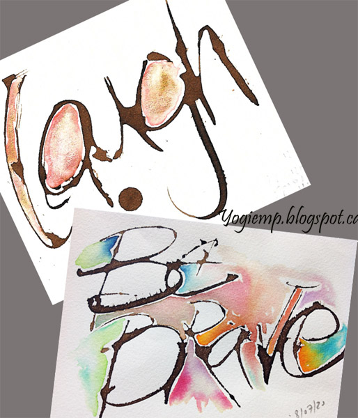 Laugh: on white Stonehenge paper using a Dreaming Dogs "Leeloo" ruling pen and plain Walnut ink. When dry painted with Calligraphica crystals (Golden Leaf and Rose Gold). BE BRAVE: on Arches Text Wove paper using a Dreaming Dogs "Leeloo" ruling pen and plain Walnut ink. Painted with Peerless watercolors. |