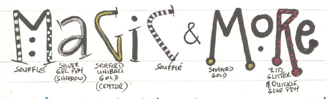 Using our same letters but with the bullet tip of a Zig Writer marker, then embellishing with various gel pens. Also adding either thin serifs with the fine tip of the Zig, or larger dots and coloring in the centers of the dots.