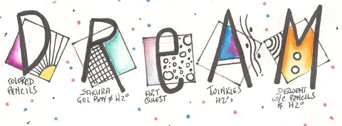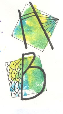 Cut out a small square stencil about 3/4" or 1" square. The letteres were done the same as above, but added little serifs and the details with a fine tipped Micron pen and added details on the letters with gel pens. |