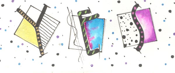I Used the bullet tip of a Zig Writer marker to make them stand out. The square and details are done with a Micron pen and colored in with various mediums. The a bunch of dots with various colored gel pens sprinkled all over the page.