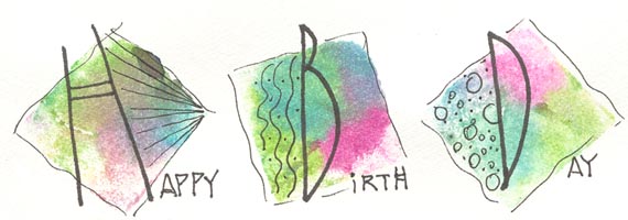 For the Happy Birth Day I cut a piece of eraser approx 3/4" square and Used Twinkles H2o's to apply color to the rubber and then misted it lightly prior stamping with it. When dry I did a squiggly line and details with a Micron fine tipped pen. The "HBD" letters were done with a thicker Micron pen