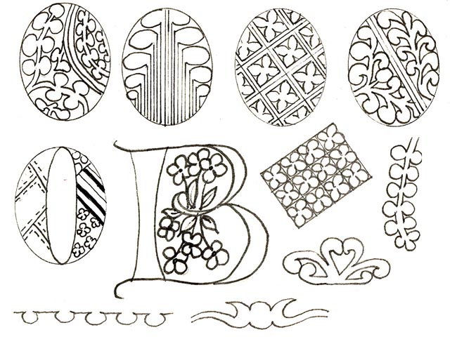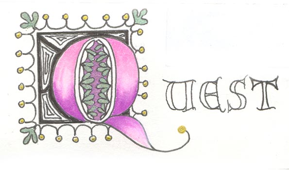 can be used in Illuminated letters. It's a good idea to design a letter and then scan and print it out in different sizes. Then start to do your decoration, 1 stage at a time, scan and print again. This way if you've done a very intensive design you can see if you like the patterns you're creating or manipulate your scanned image in a photo editing program. |