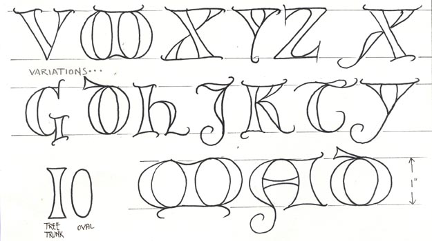 It all starts with a "tree trunk" shape and an "oval" shape and then bulges... the good kind. I cut out the tree trunk and oval from a piece of stencil plastic and used that to create 90% of my letters. There are always some letters that just don't fall as easily into the set pattern. Drew them in pencil first, erasing until I got the shape that pleased me, then went over my lines with a Zig marker. The "x" height of the letters is 1". I also have a tendency to go above and below my lines. Can't keep me boxed in. |