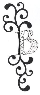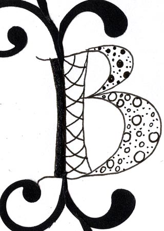 After doing the very graphic "B" I wanted to do something with some Oriental paper I have. I also used a cream toned cardstock so did the decorating with a gold gel pen and outlined with a black Micron pen. |