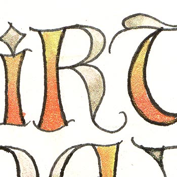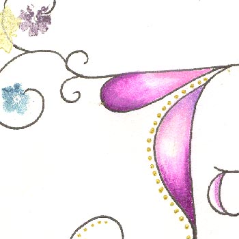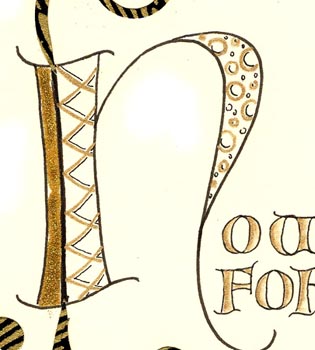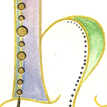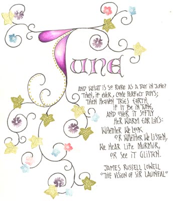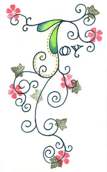 Joy was also done with Prisma colored pencils. the flourishes with a green Zig marker and leaves and flowers were rubber stamped using Versafine stamp pad. Some gold dots were added. Compare it with the "J" in June below |