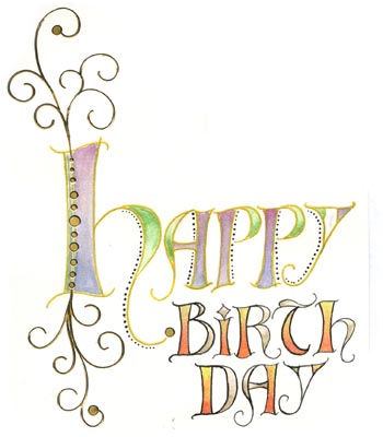 The "happy" is done with ArtQuest watercolor palette, blended with H2o, outlined with a gold gel pen, accented with black Micron dots, And Peel off Flourishes trimmed to fit and peel Off dots added here and there and along the trunk of the "h" "Birthday" is also done with ArtQuest, outlined with a black Micron pen