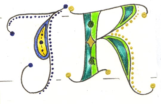 Both these letters were done with Prisma colored pencils, a touch of white in the "K" and blended with a Lyra Splender Blender. Blue dots were added to the "J" and glitter and gold dots to the "K". |