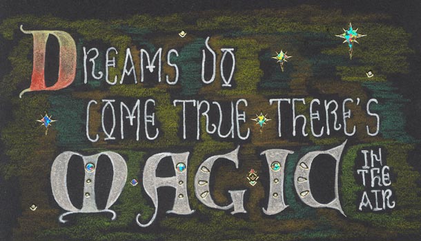 I used a Full Spectrum Color Line black cardstock. Drew in my outlines with a Ranger's white Inkssentials pen then colored in the "D" with ArtQuest watercolor palette. The "Magic" was done with the Pearl White color. Used the flat of my Prisma colored pencils to color between the letters. No white was used first so the colors are more muted. Peel Off dots and stars from the holographic sheets were added. |