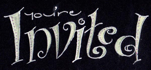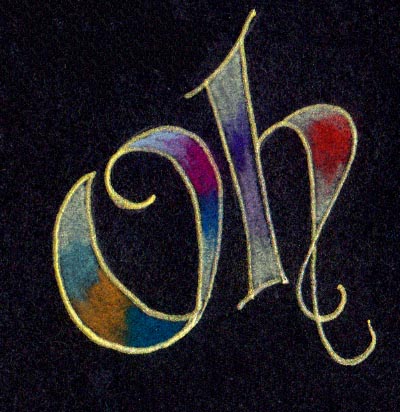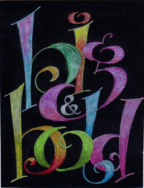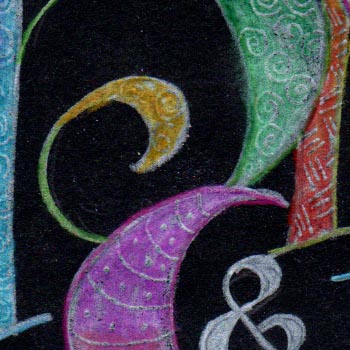 I first colored in my letters with a white Prisma colored pencil, then with a fine tipped stylus, through a piece of clear plastic cellophane type paper (so you don't get a coating of wax from the colored pencil on your stylus), created my embossed designs. Then colored over the designs with the flat of my pencil. Because I did the white coloring first and then the dry embossing I got a white pattern design. You can also do your designs first without the cellophane paper, then with the flat of your white pencil color in your letter and then do the coloring again with the flat of your pencils. Also note the way the letters intertwine with each other. On several of the other samples the letters either lay side by side (usually touching) or just lay on top of another letter. But with this one I really wanted a bit more interaction between the letters. |