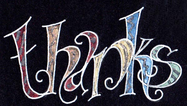 The image does not do the lettering justice... The outline is a white Ranger's Inkssentials pen. I then used some Crayola crayons as a resist to put some design into each letter. I then colored over them with some water colors (Fine Tech brand of Pearl watercolors), but any watercolors will give the same effect. Again note the way the tail of the "S" wraps around the "k". To me it feels like a hug and this style of "Thanks" would be given to someone special who you enjoy hugging. |