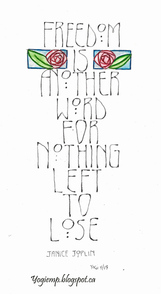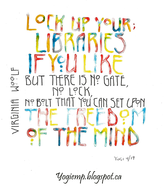 ID: Lock Up Your Libraries This exercise was supposed to be melding of colors. I did more of a dropping in color into wetness. I used a relatively large "B" nib dipped into water and then my color dropped in one letter at a time on the less textured side of Canson Mr Biggie 90# CP watercolor paper. (Holbein "Peacock Blue"; Winsor Newton "Winsor Red"; Grumbacher Academy "Cadmium Yellow"). The black letter done with the Zig fine tip point. Words: Lock up your libraries if you like; but there is no gate, no lock, no bolt that you can set upon the freedom of the mind. Virginia Woolf. |