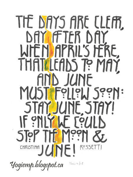 Clear The exercise for this one was to run some color between letters like a stream of water flowing down. Used a Zig Writer bullet tip end and a bunch of joined letters on the less textured side of Canson Mr Biggie 90# CP watercolor paper. Watercolors and water between the letters. Words: The days are clear, day after day, when April's here that leads to May, and June must follow soon: Stay, June, stay! If only we could stop the moon & June. Christina Rossetti |