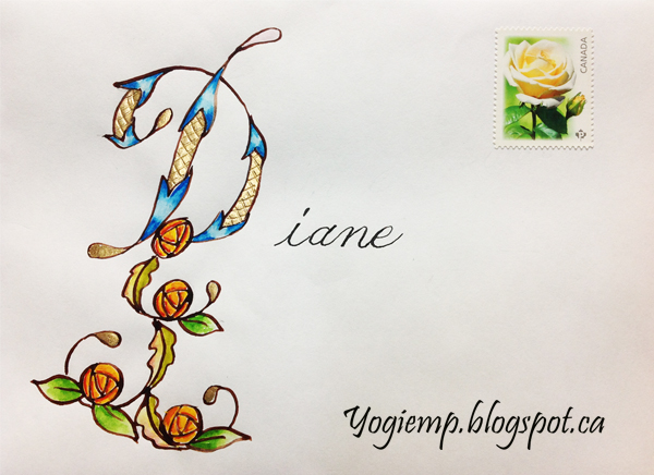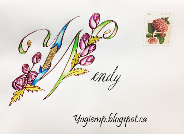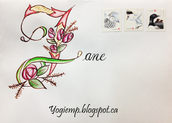 June 10, 2019 A start to adding every letter of the alphabet... only 16 more to go... These are for an envelope exchange I'm in all done on with 5 x 7" envelopes I drew all the letters and then inking everything with the Macffrey's brown ink. Applied my gilding adhesive, then Robertson Red Gold 23kt leaf. Tooled the gold with a very fine pointed stylus. Painted with watercolors.