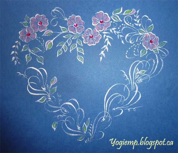On dark blue Recollections 65# cardstock, using a Nikko G nib and Kuretake Silver Mica ink created my flourished design. Colored the florals with Black Edition colored pencils and added red adhesive backed rhinestones. I'll eventually make it into a card and add text...