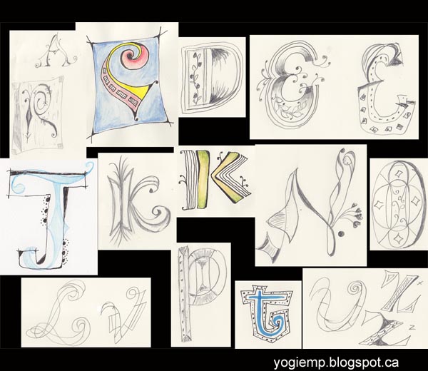 On Genoa bond paper work samples of the letters which will be created on better paper...The "J" was done on 90# Arches HP watercolor paper using Derwent inktense watercolor pencils. Letter sketches created with graphite pencil or Micron pen.