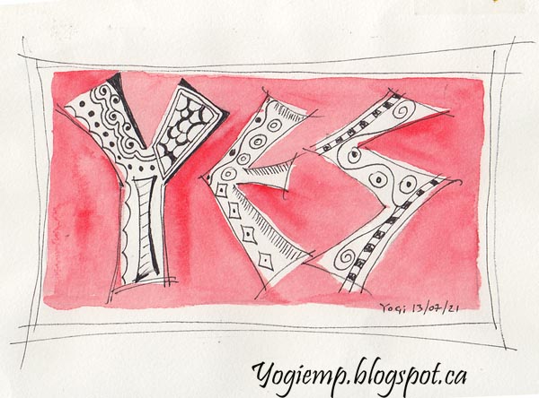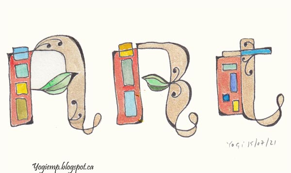 ID: Day 3 - Art Size: 7"w x 3"h On Arches Text Wove, drew my letters using a Zig Write. Painted with QoR watercolors. |
