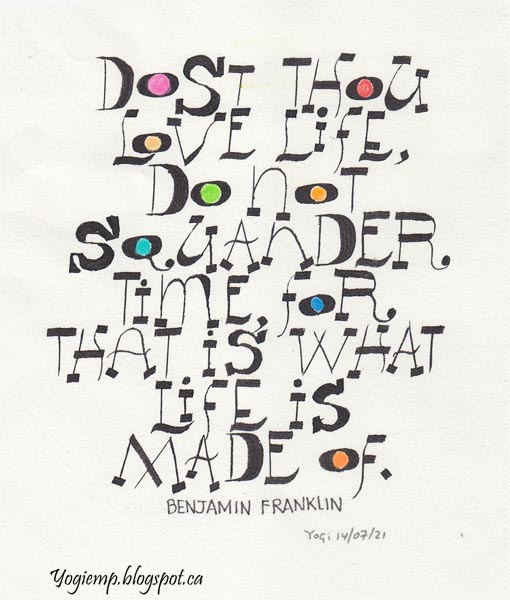 Thou Love On Arches Text Wove and using a 2.4 Parallel pen and Sumi ink, wrote out/drew my letters. Colored the interiors of the "o's" with colored pencils. Quote: Dost thou love life, do not squander time, for that is what life is made of. Benjamin Franklin |