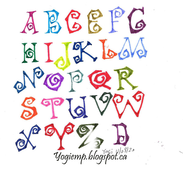 Our assignment on day 1 was to create an alphabet... I'm content other than it needs cleaning up, a bit more consistency etc. On Staples 110# white cardstock created my letters using Tombow markers - each letter in a different color...