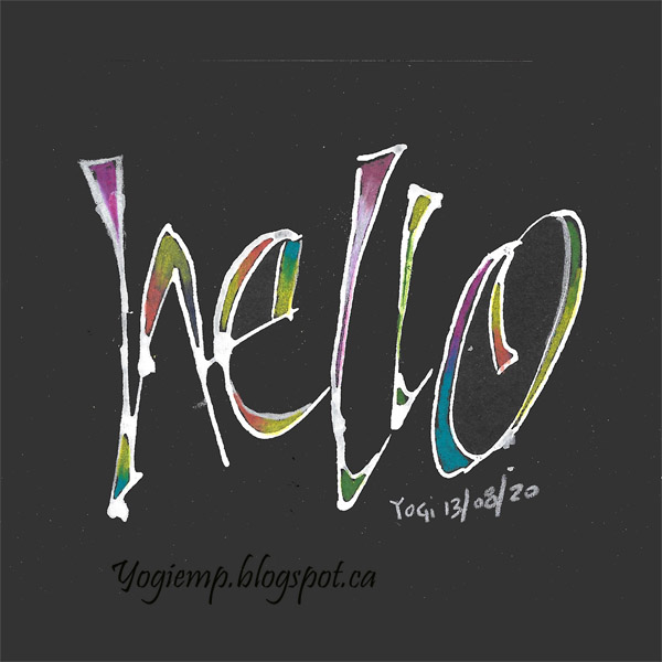ID: Hello On black cardstock using a fine liner bottle filled with Bleed Proof white ink, wrote my letters. Dried ad colored with Prisma colored pencils. |