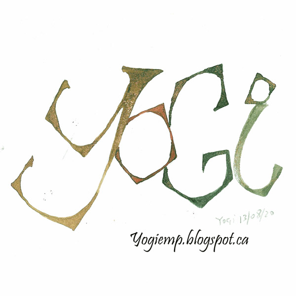 ID: Yogi Lightly drew in my letters with an HB pencil on Aches 90# HP watercolor paper. Painted with Walnut ink ("Y") and Bister inks ("O, G, I") and sprinkled with Neuberg Ebel Fine copper powder. |