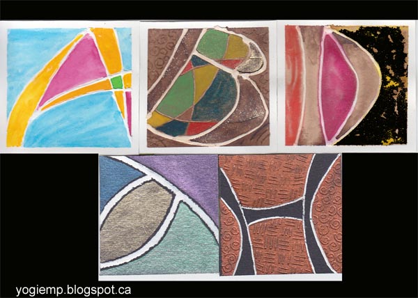 ID: A, B, D, a, H All done on Arches 90# HP watercolor paper. A: white gesso, various watercolors B: white gesso, Walnut ink sprinkled with Schminke gold powder, designs scribed with a small balled stylus. When dry painted with various watercolors. D: white gesso, painted with walnut ink and watercolors. (the black area on the right is actually and ochre color with lots of blooming. a: Bleed Proof white on Arches black watercolor paper. Painted with Twinkles H2º. H; Bleed Proof white on Arches black watercolor paper. Painted with Dr Martin's Iridescent Calligraphy Copper