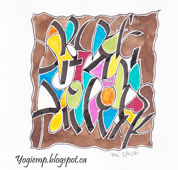 2021 I'm taking another online Zoom class with Julie Wildman "Every Letter Is A Jewel" On Arches HP 90# Watercolor Paper, 3.9 Parallel pen and Sumi ink, wrote out the alphabet in a funky style. Left if overnight to dry waterproof (note, not all Sumi is waterproof when dry... Moon Palace is). Added Twinkles H2º to some of the negative/positive areas. Diluted Walnut ink sprinkled with Schminke gold powder for around the outer areas.