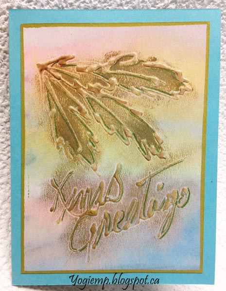 Gesso Resist - Leaves - Xmas Greetings I drew my leaves and wrote out the greeting with a mix of Liquidtex Clear Liquid Gesso mixed with Golden Matte Medium and some water in a needle tipped bottle on cheap watercolor paper. When dry painted the background with QoR watercolors (Quinacridone Gold, Permanent Scarlet). When dry rubbed with Art Alchemy green in the leaves and "Vintage Gold" on the words. Added a green Prisma colored pencil shadow. Edged the artwork with a Kuretake gold metallic pen. Adhered to a aqua blue card base.